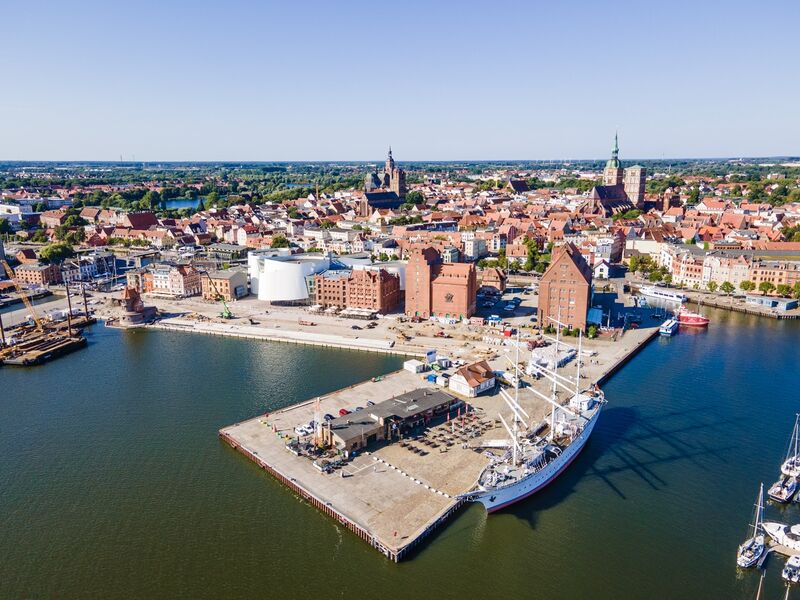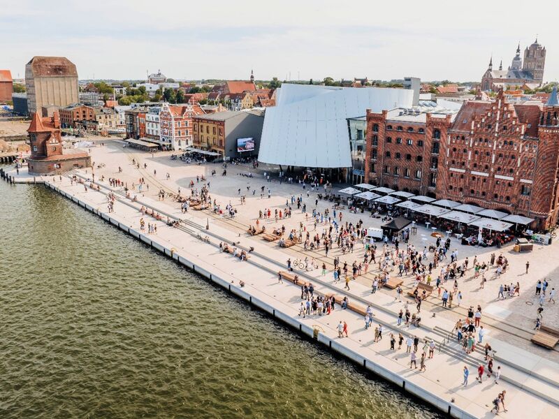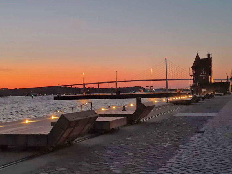 Ein besonderes Highlight ist Schaffung einer neuen Stufenanlage aus Betonelementen mit Sitzstufen entlang des „Hansakais“, die sich zum Wasser entwickelt und zum Aufenthalt und zum Genießen der Aussicht über den Strelasund bis hin nach Rügen einlädt.